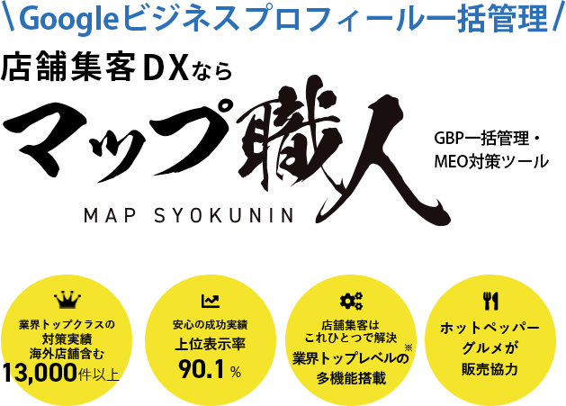 マップ職人には、業界トップクラスの上位表示率90.1%以上の弊社のノウハウを凝縮したアドバイス機能を搭載しております。Googleのガイドラインに沿った正しい施策で上位表示が狙えます。