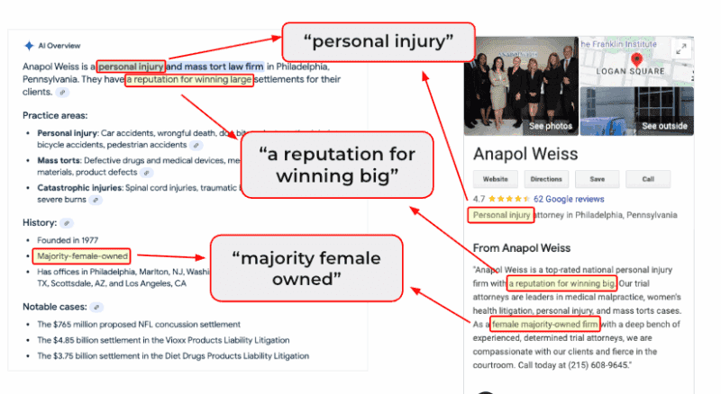 また、AIによる概要(AI Overview)では以下の画像のようにGBPの内容から回答が生成されていることが見られています。