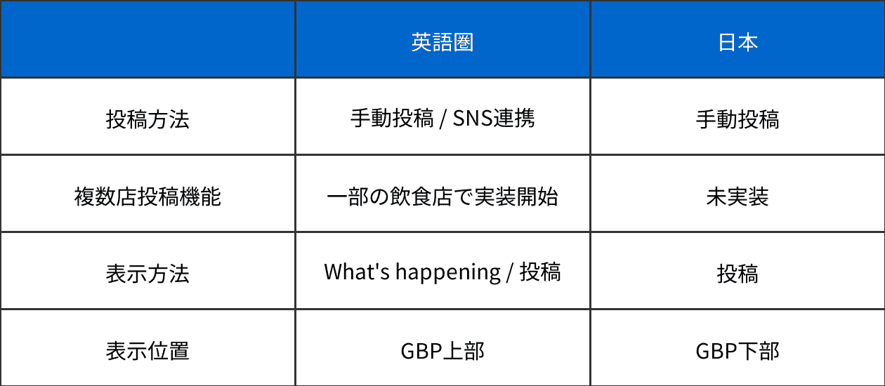 日本の現在の機能を整理しておくと、まだ英語圏の国に比べると実装機能はほとんどない状態で、イベント投稿に限らず、更新・特典・イベント投稿のいずれもGBPからの手動投稿のみ、SNSとの連携もなく、もちろん複数店舗の投稿は行えません。